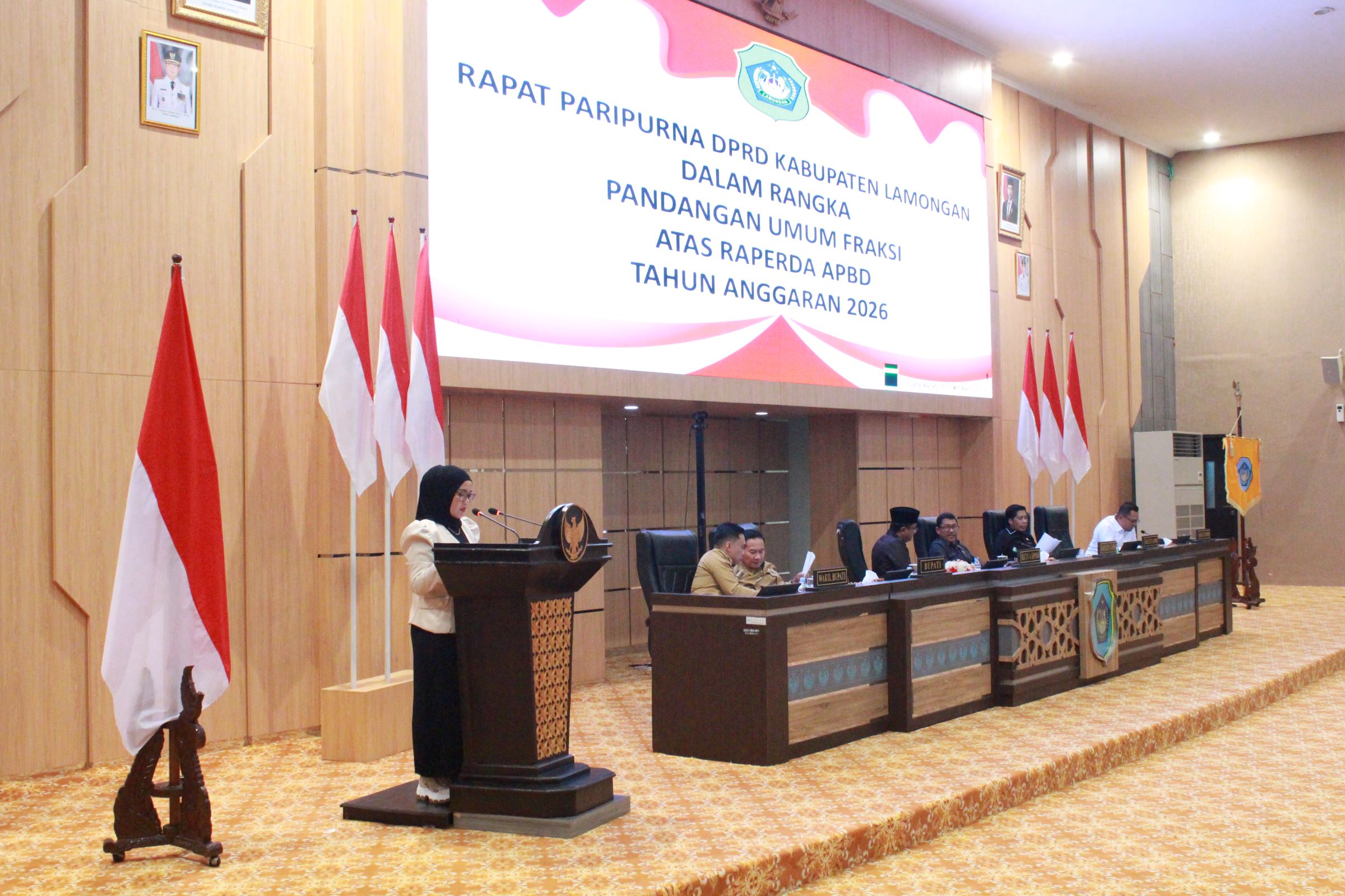 Lamongan, 13 Oktober 2025 – Fraksi Partai Gerakan Indonesia Raya (Gerindra) DPRD Kabupaten Lamongan menyampaikan Pandangan Umum terhadap Nota Keuangan Rancangan Anggaran Pendapatan dan Belanja Daerah (RAPBD) Tahun Anggaran 2026 dalam rapat paripurna DPRD Kabupaten Lamongan.