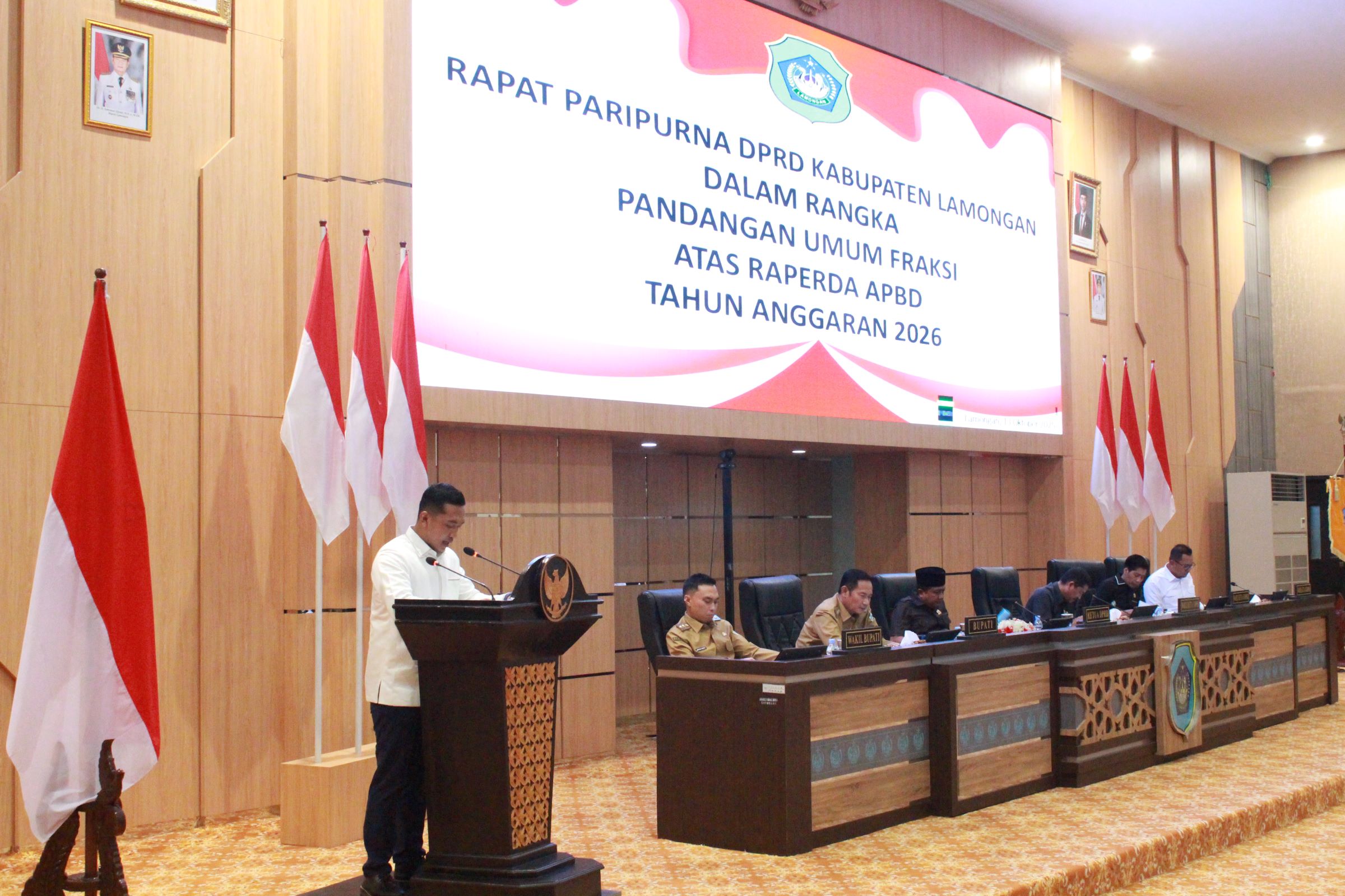 Lamongan, 13 Oktober 2025 – Fraksi Partai Demokrat DPRD Kabupaten Lamongan menyampaikan Pandangan Umum terhadap Nota Keuangan Rancangan Anggaran Pendapatan dan Belanja Daerah (RAPBD) Tahun Anggaran 2026 dalam rapat paripurna yang digelar di ruang sidang DPRD Lamongan.